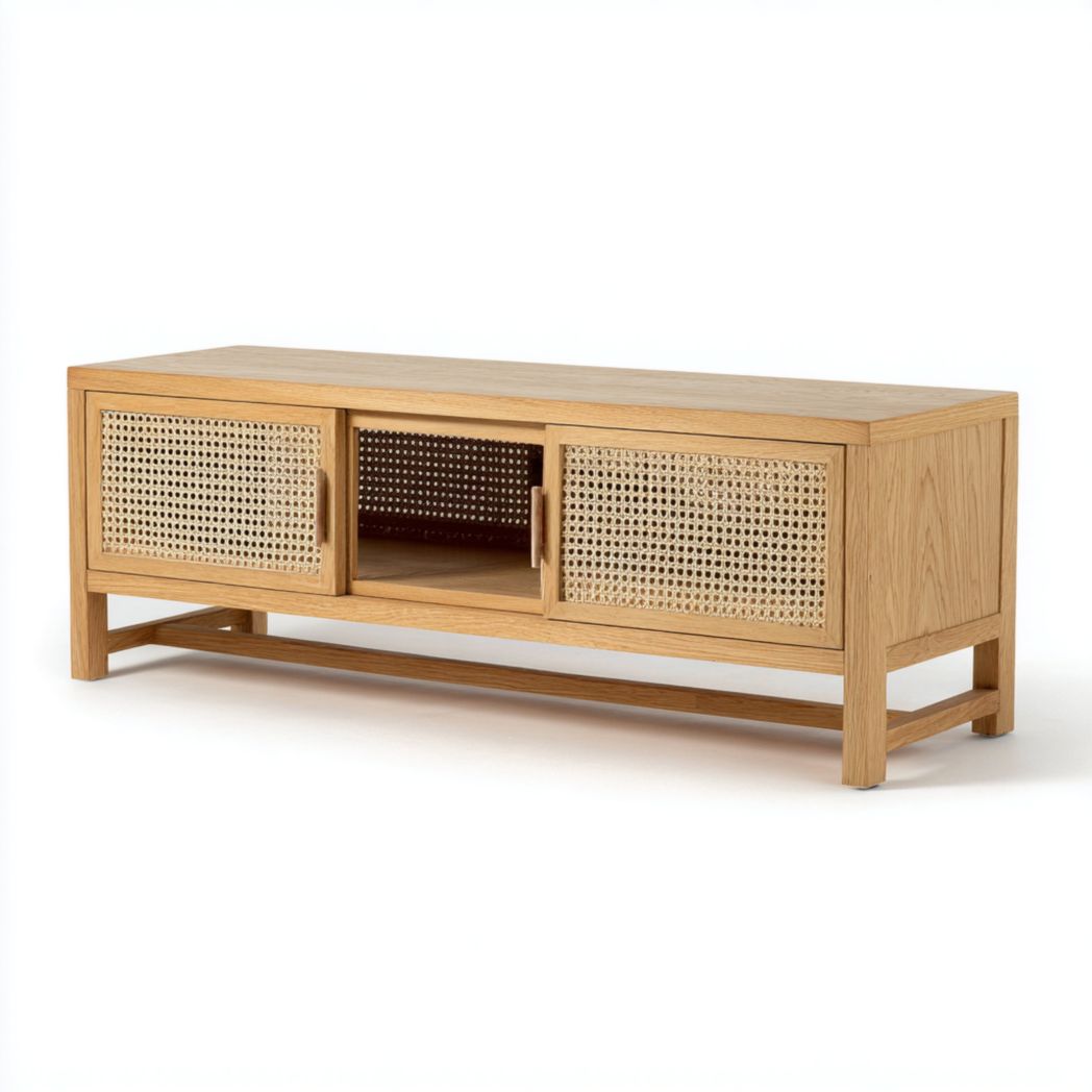 Banc TV en Chêne avec 2 Portes en Rotin et Compartiment Ouvert