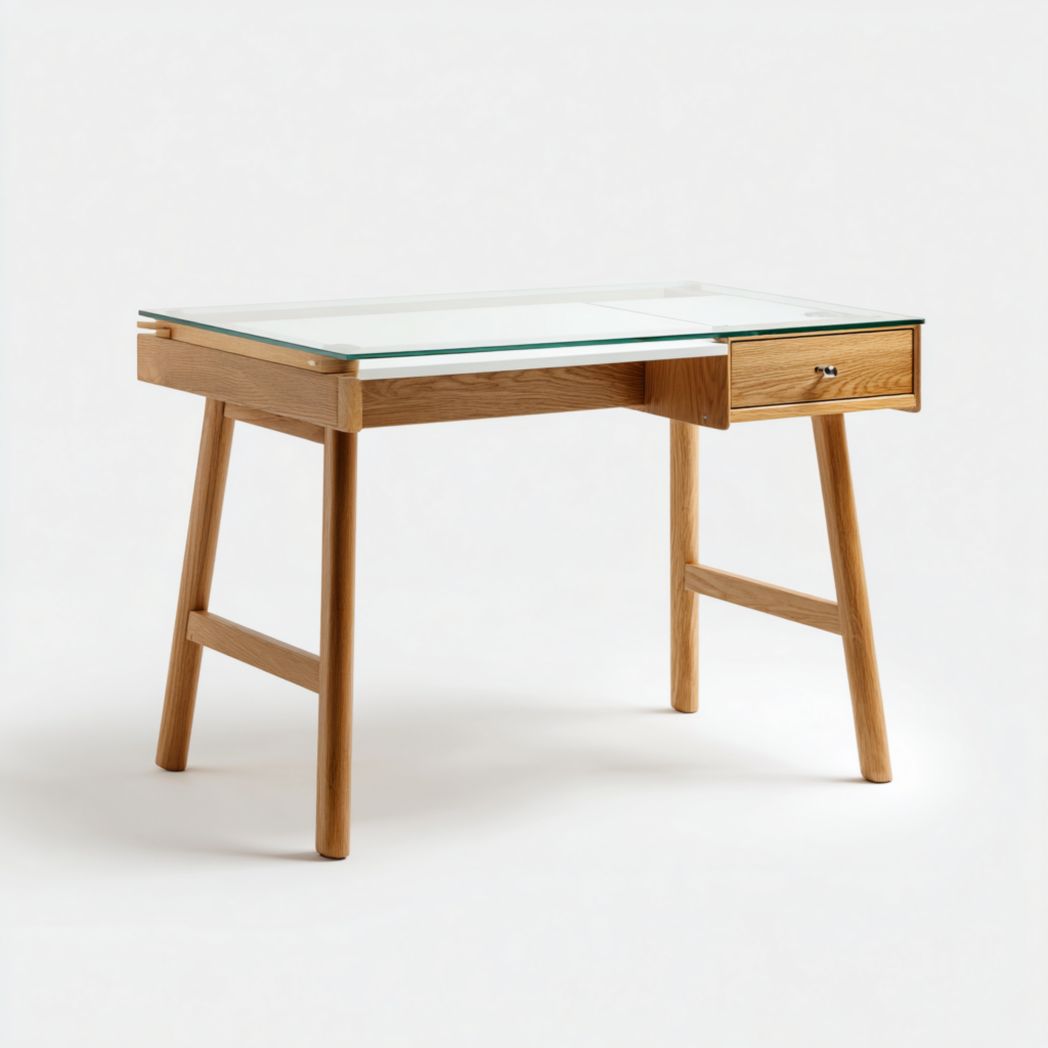 Bureau avec plateau en verre trempé et structure en chêne massif avec tiroir