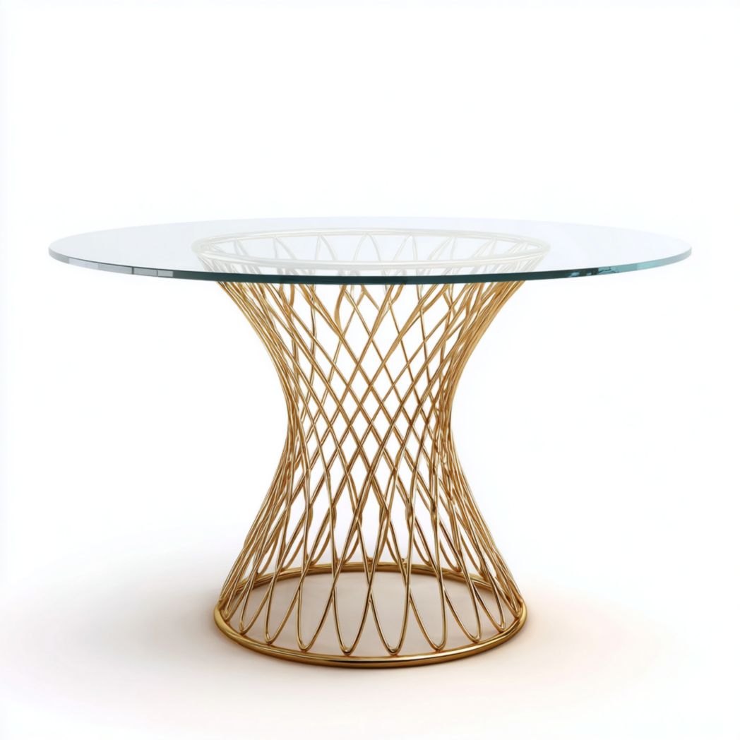 Table de repas ronde avec plateau en verre trempé et base sculpturale en métal doré